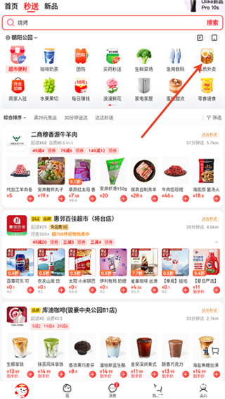 1、打开软件后,因为咱们和其他外卖平台,并非是独立app,而是在京东app内,所以进入主页,点击旁边的【秒送】