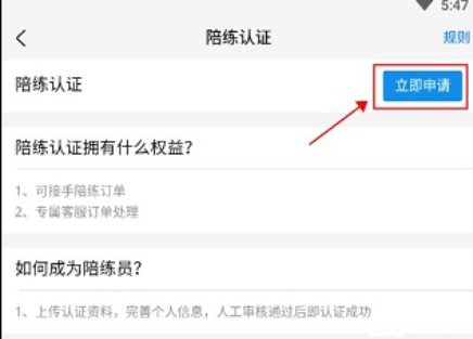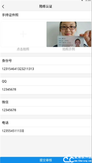 3、在【陪练认证】板块,需要输入你的身份证、相关联系方式以及手持证件照后提交审核。