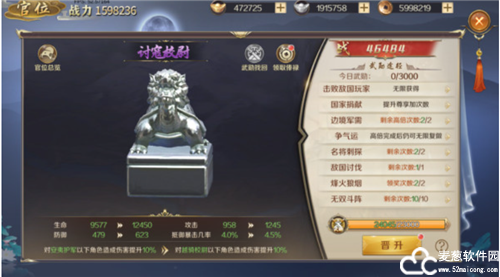 官位系统是里面提升战力最多的,但要求也比较高,提升官位需要获得相应的功勋,功勋可以完成一些日常任务获得,也可以使用元宝找回。功勋和能否晋升官位是直接联系的,官位可以领取的俸禄也会越多。