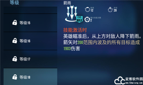 1、箭雨技能激活时,英雄瞄准后,从上方对敌人降下箭雨。