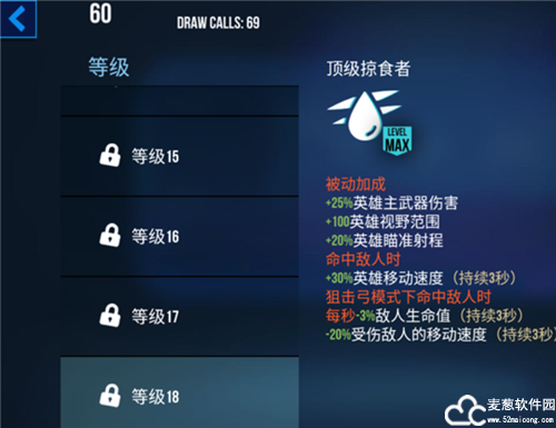 3、被动技能-顶级掠食者这个技能可以给自身英雄增加许多受益buff,在英雄的瞄准射程、英雄的视野范围、武器伤害、增伤、减速属性等,都有加成效果,具体可以点击游戏内的技能说明进行查看,技能等级每到下个阶段都会有所提升