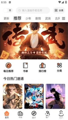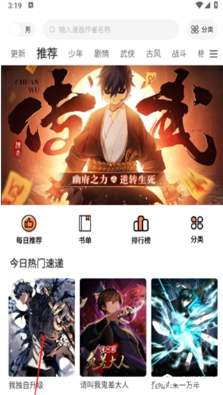 4、进入首页推荐板块,今日热门速递都是时下热度超高的漫画佳作,我独自升级、请叫我鬼差大人等。