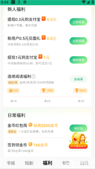 2、这里有新人福利以及日常福利,大家完成上述的任务后即可得到现金和金币奖励,都是可以提现的。