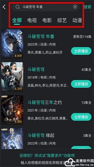 2、比如我想看斗破苍穹年番,输入后直接搜索,就会匹配对应资源。