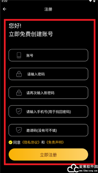 4、立即免费创建账号,输入账号、密码、手机号即可。
