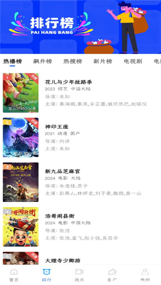 4、排行榜内收录了时下播放量超高的作品,分为热播榜、飙升榜、热搜榜等。
