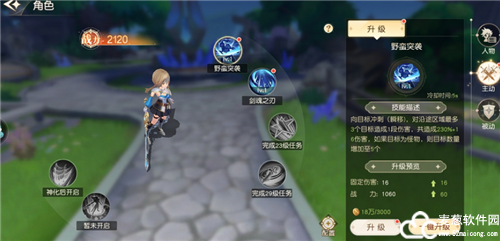 1、首先就是给技能升级,像【野蛮突袭】可以向目标冲刺,对沿途区域最多3个目标造成1段伤害,等级越高,伤害越大。