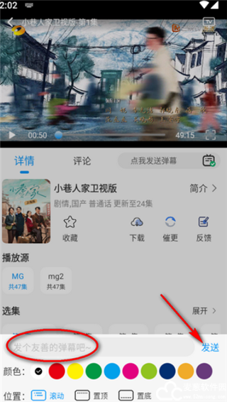 1、首先大家需要找到自己想看的剧集,比如很多朋友在追的小巷人家,进入播放页面后,点击对话框发送弹幕。