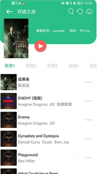 2、比如我想听双城之战,系统会自动匹配相关歌曲。