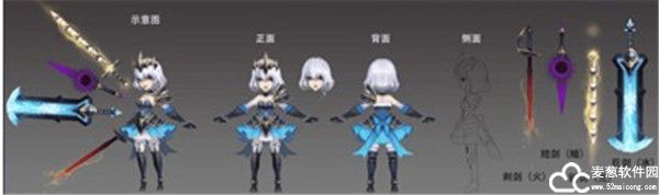 (3)薇是一名十八般武艺俱全的武术天才。但她最喜欢用剑。身为女王,她拥有许多不同的剑,各自对应的技能。因此我们为她设计了各种完全不同的剑。长剑和开加上靛蓝色的底色与黄金镶边暗示了她皇家的尊贵身份。