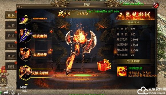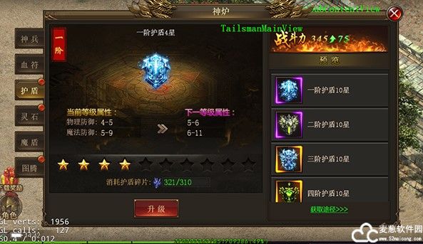 神炉系统分为六大部分,分别是:神兵、血符、护盾、灵石、魔盾、图腾;除了提高战力外,它们还分别提升不同的基本属性。