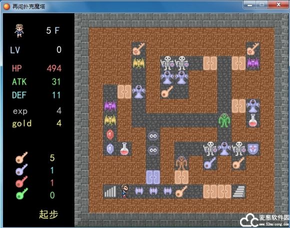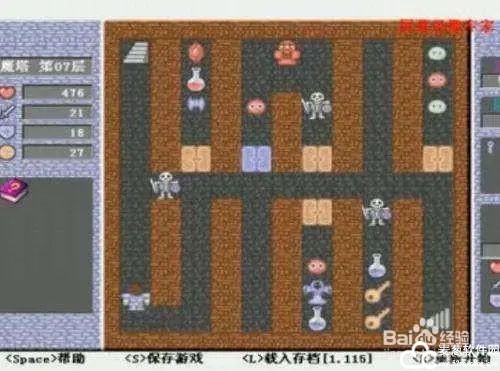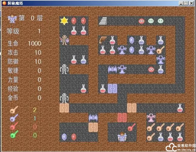 重要!现在向上冲会受到蝙蝠的大量伤害。而只要加1点攻击达到21就能少受蝙蝠的一次攻击,使得伤害从56减少到28,直接减半。回4楼,开下侧右边门打一法师拿宝石,血瓶暂时不拿。打左下房间蝙蝠和1小绿拿钥匙。(这些钥匙是后面为了避开所有的骷髅所必需的,可以存个档试试同样的路线,20攻打会剩多少血)