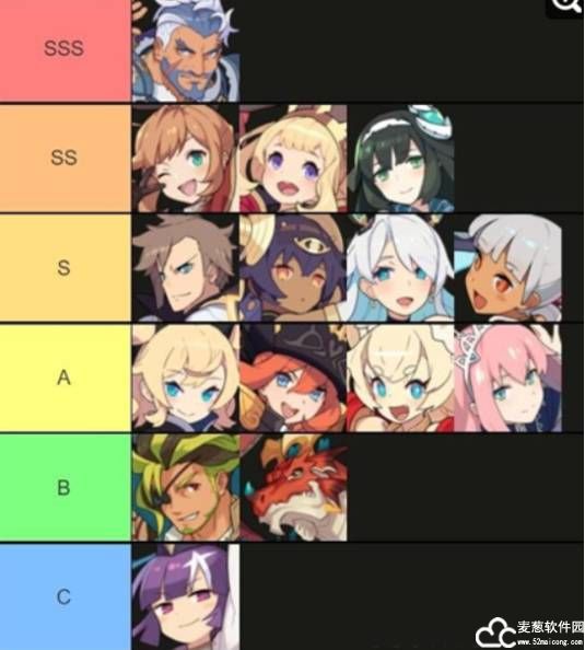 游戏中角色的强度从高到低分为SSS、SS、S、A、B、C,其中SSS的有暗gay,SS的有佐仓、风奶和老男人.....
