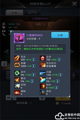 特种兵特点:增加对坦克伤害25%,自带闪避。
