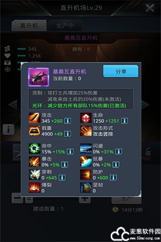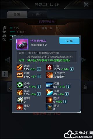 导弹车特点:攻打直升机增加25%伤害,减免导弹车伤害20%,自带暴击。