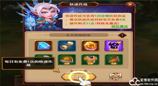 萌新前期领主等级和挂机收益都是和主线关卡密切关联的,而快速作战可以让我们快速获取当前挂机收益来提升领主等级,领主等级提升我们就可以挑战难度更大的主线关卡来获取更多的挂机收益,从而更快的解锁游戏新玩法。(所以前期想要快人一步的领主大人可以优先激活快速作战特权,它不仅增加免费快速作战的次数到4次,还额外增加了11次可钻石购买的快速作战次数)