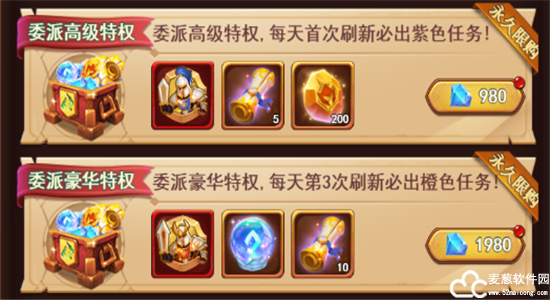 委派玩法不仅能获取传奇召唤卷轴,还有大量的钻石碎片纹章等资源,是游戏中获取优质资源的最好途径之一,领主大人只需将英雄派遣到心仪的委托即可在完成委托后获取奖励,而相对应的不同等级委托的奖励也有所不同,由委托等级对应的颜色进行排序,红色>橙色>紫色>蓝色>绿色>灰色,其中紫色以上的委托任务奖励都较为优质,但其刷新的频率对比紫色以下的委托也较低,所以为了频率高效的获取更优质的资源,推荐萌新优先激活委派高级特权&委派豪华特权