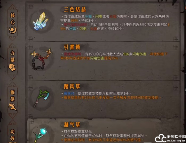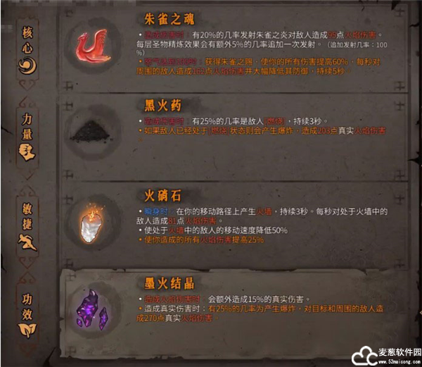 4、火流派就是使用葫芦的醉剑流派,这个葫芦直接成为玩家的本体,搭配太祖词条刷到火伤再搭配装备朱雀、火药、硝石、火结晶直接成为纵火犯,使用葫芦射出的火鸟可以对四面八方的敌人造成一个持续的伤害,buff也尽量选择和火焰有关的这样玩家就能解放攻击按键了,只要主要好输出位置和释放技能的时机其他都可以交给葫芦解决了,葫芦的一般攻击频率不高全靠玩家释放技能的时机把握,全屏充满玩家的火鸟完全可以一键清场。