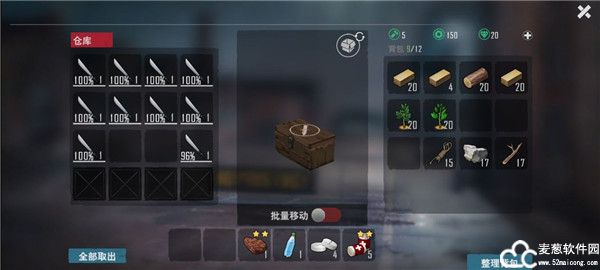 捡刀(最强近战就是这里的),召唤空投,看自己要啥吧,可以召唤多点树苗,后面就不围墙,直接种树,把背包和车的背包都塞的满满的,啥都不缺。