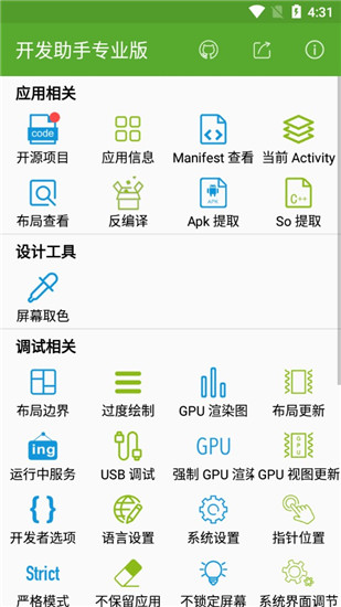 开发助手专业版,它可以帮助用户快速的调试手机应用,实现对应用的修改,信息查看,反编译的目的。同时,软件还收录了十分丰富的开源代码,可以供用户们进行借鉴和学习,你想要的各种素材和源代码都可以在这里找到,大幅的提高用户的调试速率以及开发效率。并且为了方便用户更加快速的打开调试的相关数据,平台提供了布局边界CPU渲染图USB调试等多种功能。除此之外,你还可以通过它了解手机的各项数据参数,无论是电量的使用情况,手机的型号,安卓版本的版本号以及其他各种硬件信息都可以通过软件显示出来。