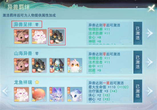 不一样的小动物可以造成差异的牵绊实际效果。伴随着全部小动物评星的提升,牵绊实际效果会慢慢提升实际的牵绊实际效果,这在于牵绊中评星最少的招唤小动物。比如,图上【龙鱼瑞祥】牵绊,评星最少的是一星应龙,牵绊实际效果是一级。