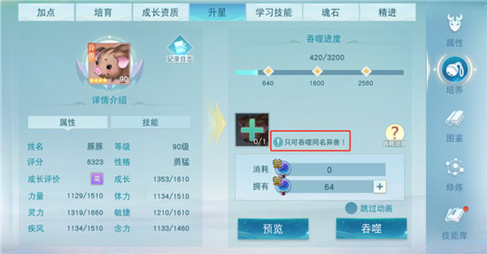 异兽吞食同名的异兽后可以升阶,提高特性和专享技能实际效果。吞食必须耗费资质证书丹。