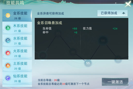 技能共鸣点系统软件将全部技能分成七个特性:生肖五行仙侠,技能升級后,相对应的技能系统软件总级别 1。每一个技能系的技能总级别到达一定规定,可以为本系的生物给予特性加持。