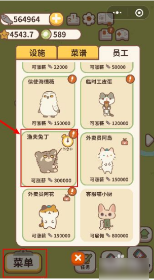 点击“菜单-员工”,再点击雇佣【渔夫兔丁】。