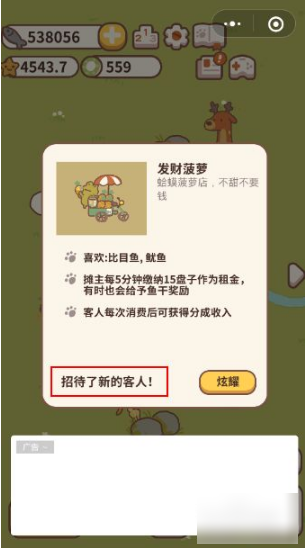 再次进行钓鱼后,就可以再次【招租】其他的新客人来摆摊,获得更多的分成。