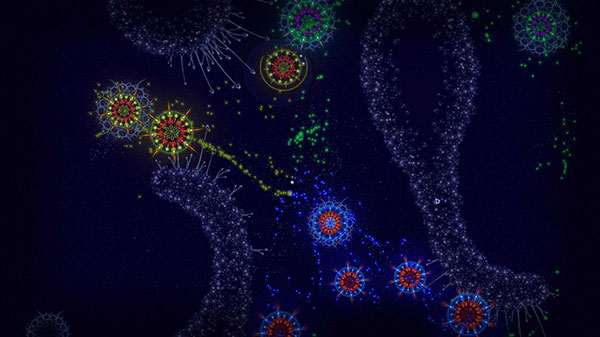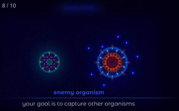 2.游戏玩家控制显示屏下边的深蓝色细胞,翠绿色细胞是对手。