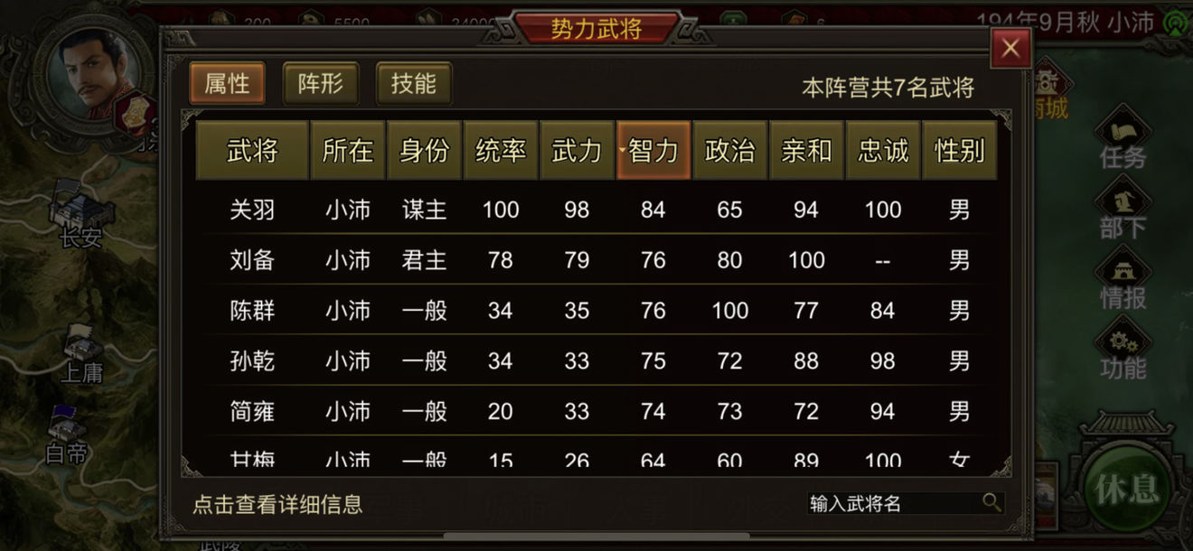 194年9月,开局刘备,手下6个武将,5500金,34000粮食,声望300,3枚政令,游戏开始。