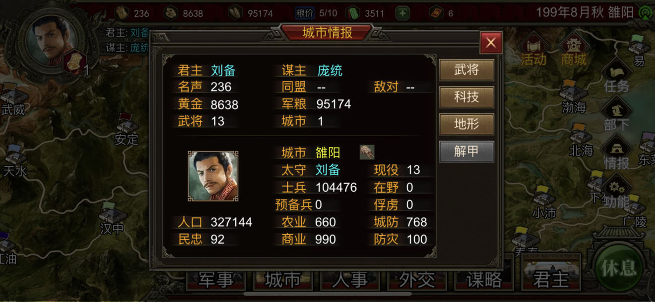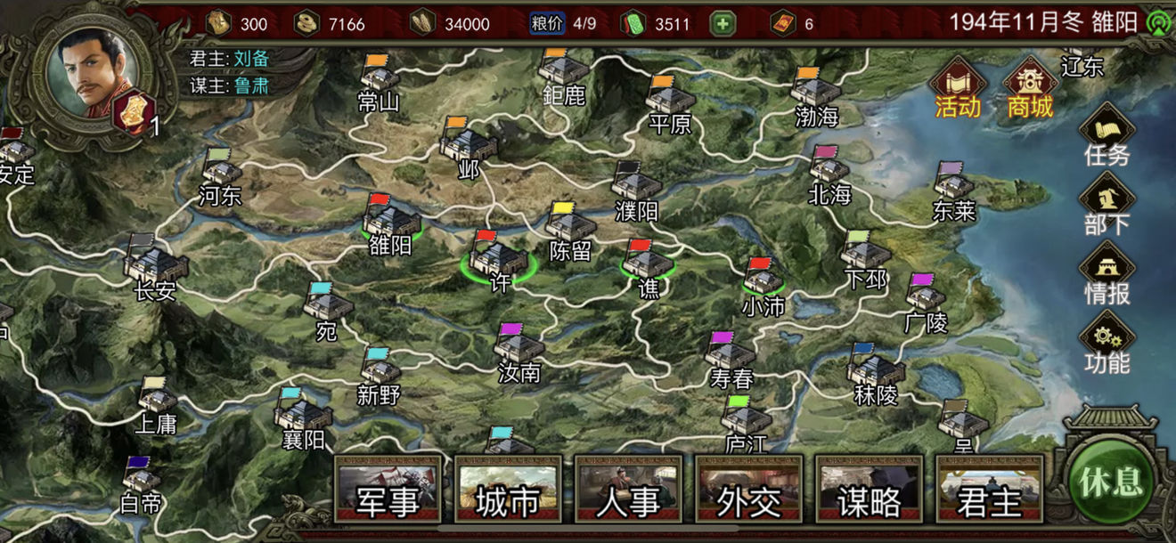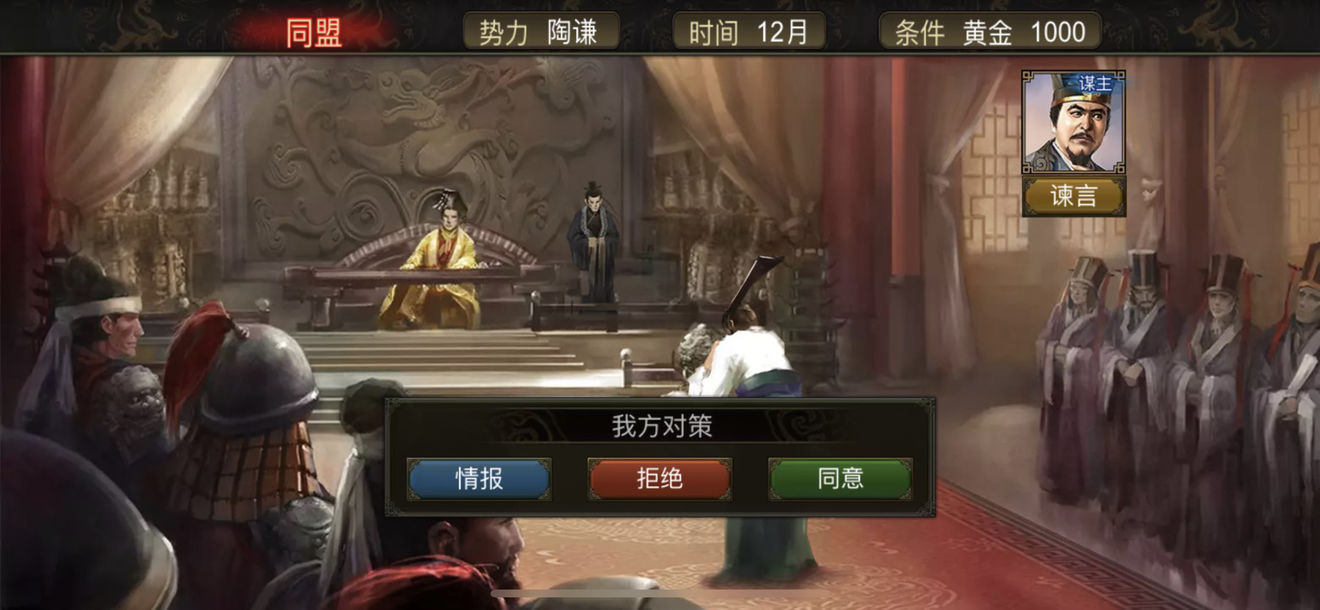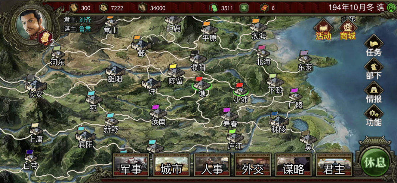 194年10月,孔融,陶谦,公孙瓒主动结盟获得3000金(这个不知道是不是每次都有),3枚政令,全体出征,占领谯消耗一个令,赏赐武将消耗两个令,休息。