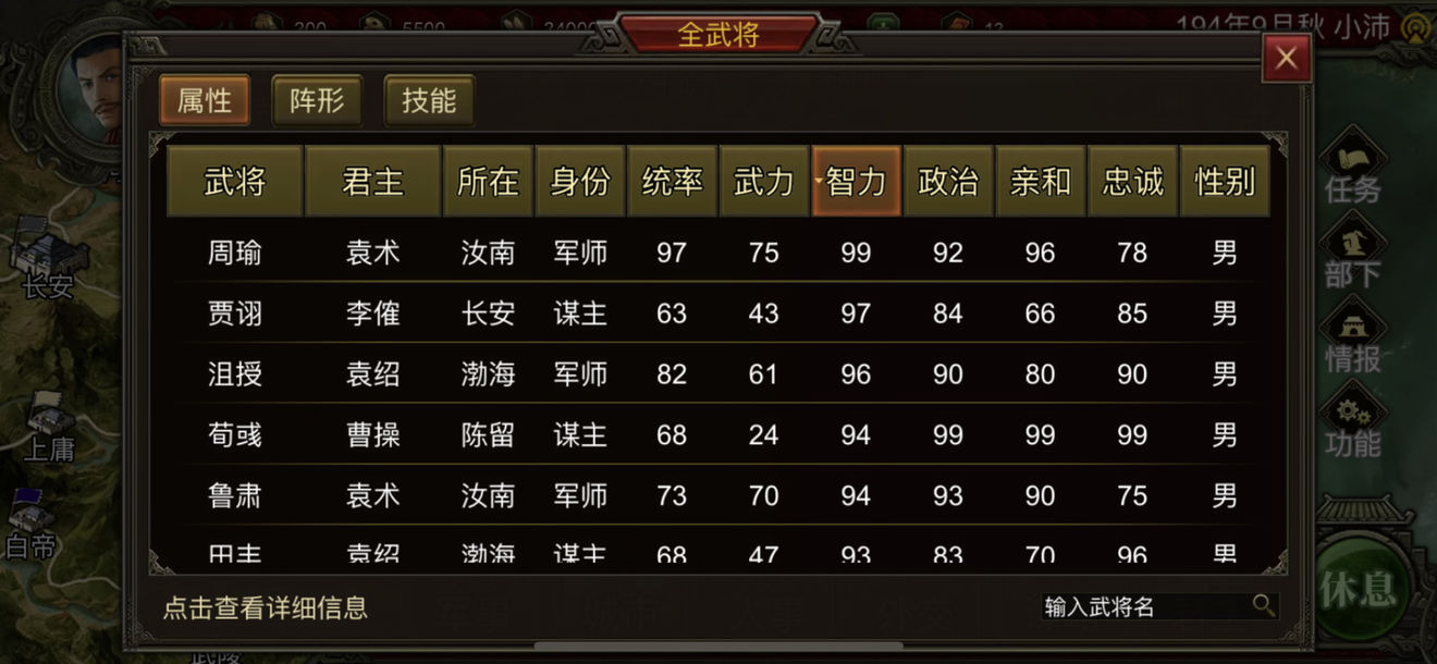 194年9月,3枚政令,一枚研究科技,一枚去汝南挖周瑜,任命谋主(关羽当谋主智力明显不合格,这时就需要不停的存读档了,我当时只挖到了鲁肃就凑合用了,贾诩,沮授也是可以考虑的),一枚提升鲁肃忠诚,休息。