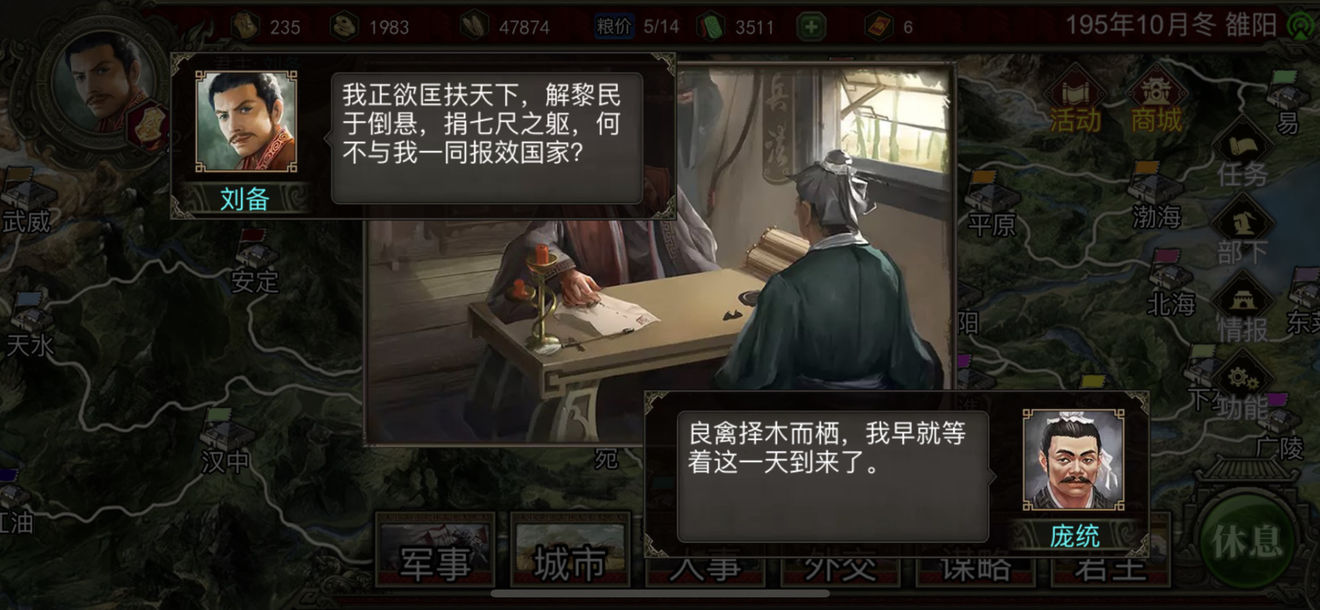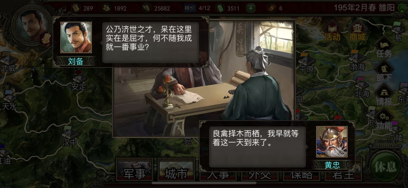 其他时间我们只需要疯狂发展内政就可以了,闲来无事可以让刘备去找表哥谈谈心,拉点赞助回来。