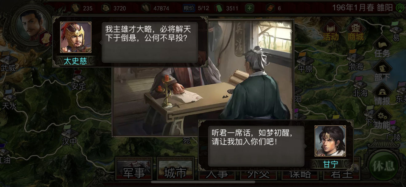 3、武将角色十分重要,发挥文臣的作用,治理城市中的问题,解决纷争,平定天下。