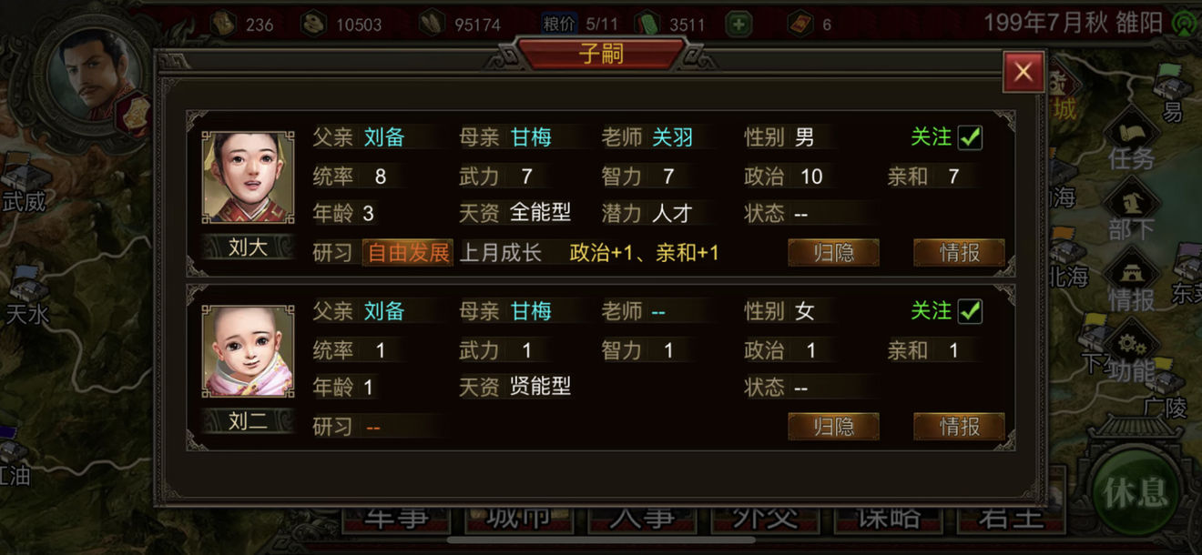 我用了5年的时间,让我们的刘备,拥有了12位武将,10万精兵,满开发的洛阳城,孩子都生了两个。无需表哥的援助也可抵御外敌了,彻底在困难194二袁相争中站稳了脚跟。
