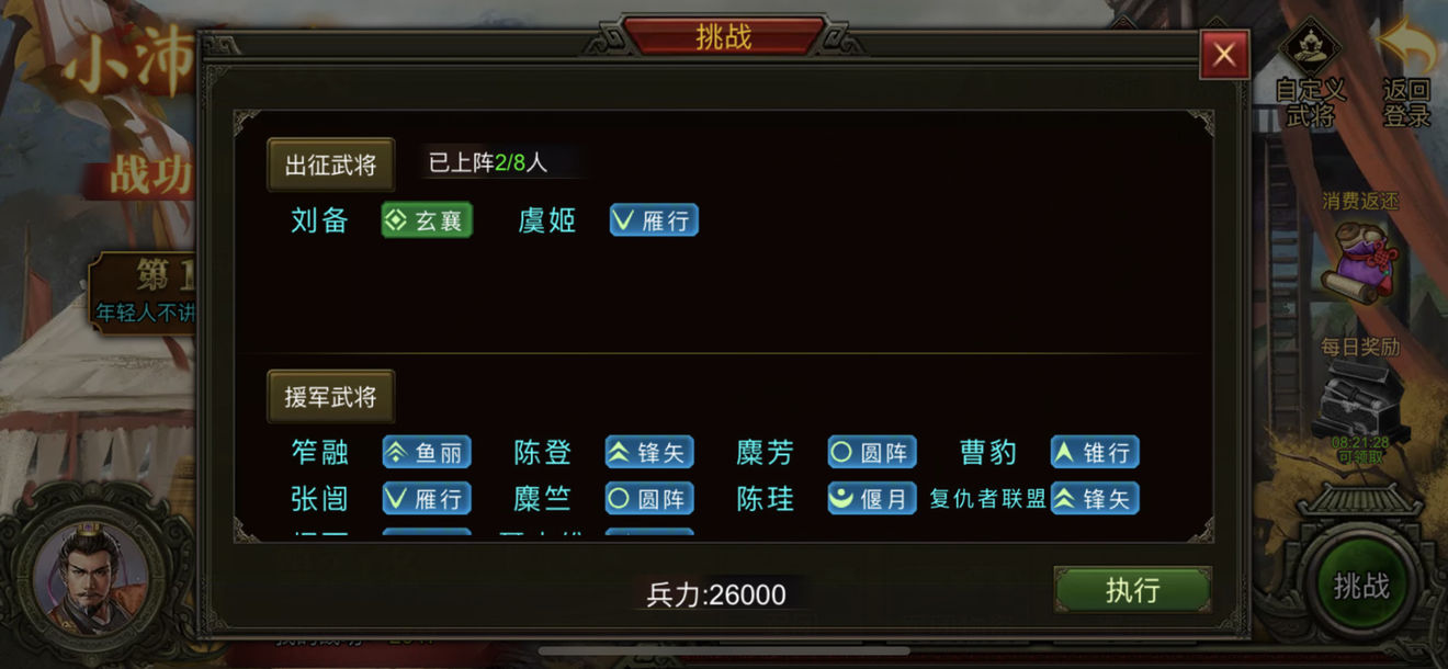 本人亲测两个小时肝出4位满等级的武将和近5000的荣誉点。