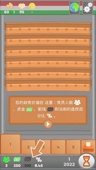 4.您的政党价值显示在左下角这里:其中包含了党员人数.资金.脏钱和当前的选民百分比。