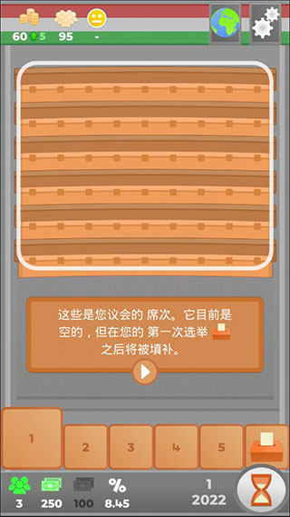 6.中间这些是您议会的席次。它目前是空的,但在您的第一次选举之后将被填补。
