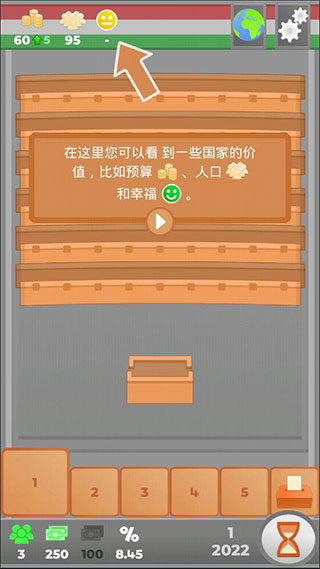 5.在左上角这里,您可以看到国家的一些价值,比如预算.人口和幸福。