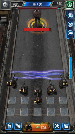 游戏玩法想必与其他塔防游戏还是简单的,在这里玩家只需将相同等级的炮台进行两两合成,即可升级成为高级炮台,每次升级提升的战斗属性,会对僵尸造成更多伤害,并且这里超过了50个不同等级的炮台等你升级,放置合并,战力升级,无限火力,自动射击,准备好迎接挑战了吗!