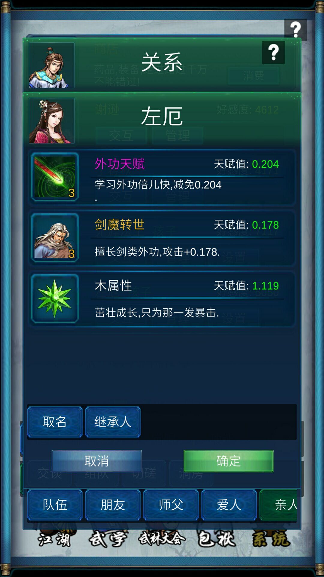 比如上图,外功属性可以减免学习消耗,剑魔属性可以加攻击,增加或减免按星级从1到5由低到高。