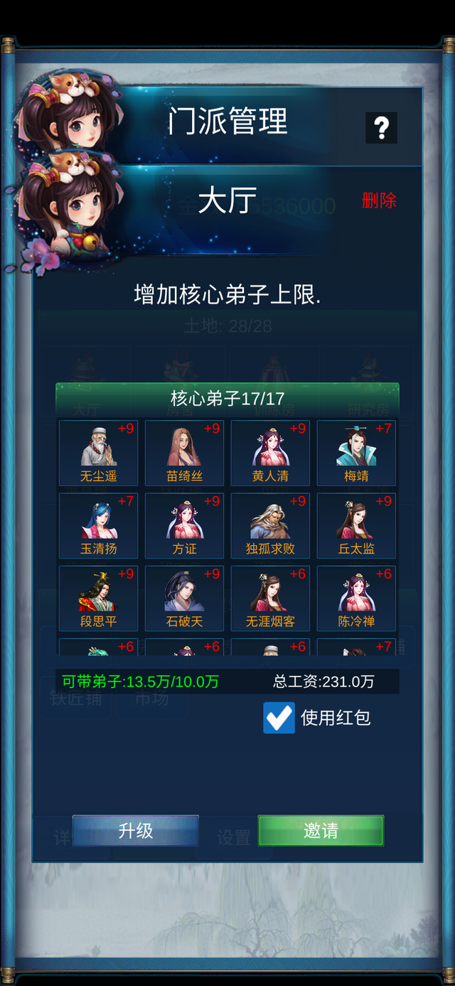 (2)给核心弟子提高职位可以增加带领普通弟子的数量,结合(1),不打算让普通弟子跟随的话,直接给他们安排最低职位就可以了,能够节省一大笔开支。