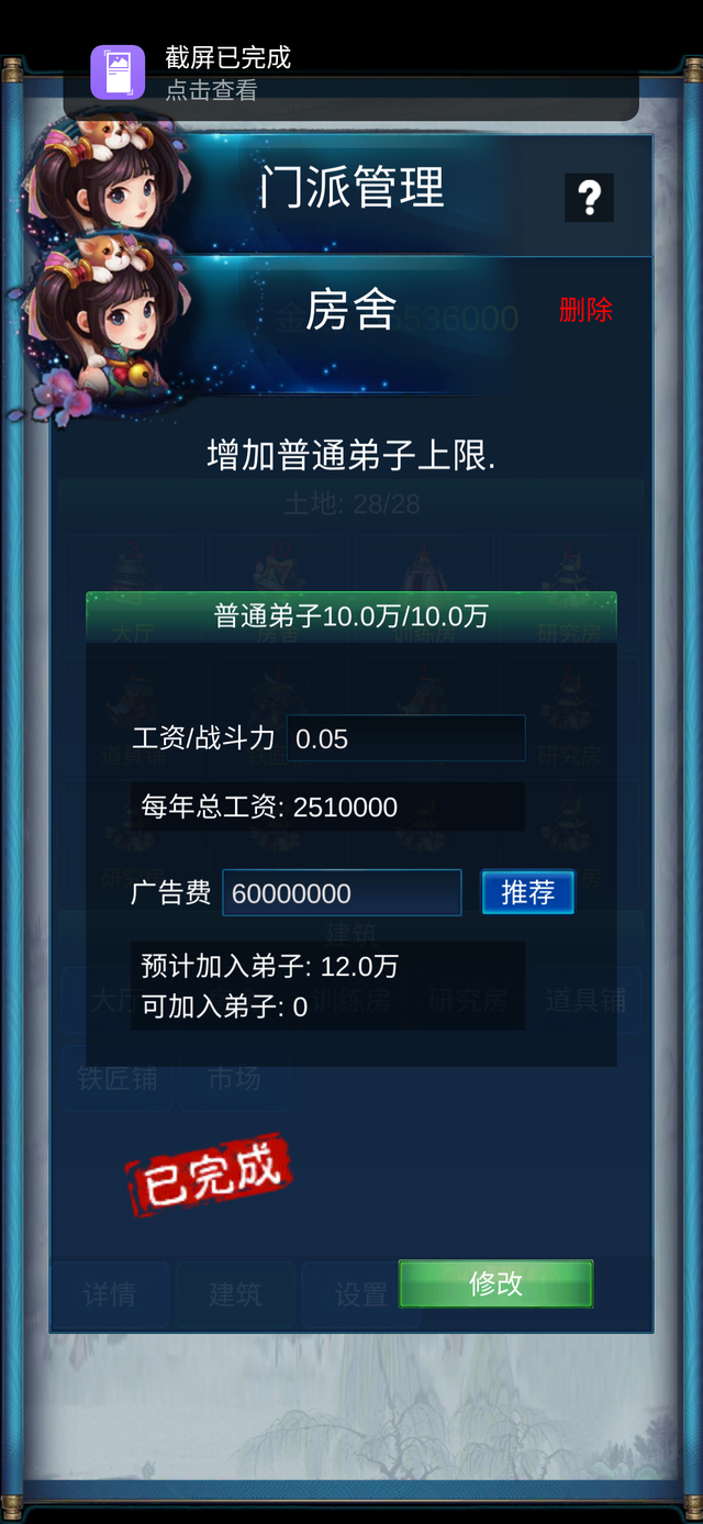 门派经营就是想方设法提高核心弟子和普通弟子的战斗力,核心弟子的战斗力主要靠招揽随机人物,因此,主角自身战力是关键。普通弟子的战斗力就要靠训练房来提高了。