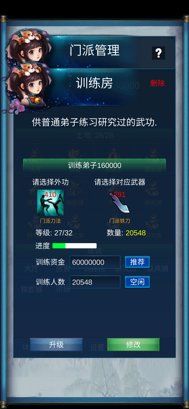 只能建造1个,可以升级,升级可以增加训练弟子的数量。为什么朝廷只有一个三宝太监,却有2.5亿的战斗力,冠绝各大门派?就是因为普通弟子非常强悍。训练房就是用来提高普通弟子战斗力的地方。训练普通弟子需要门派武功和相应的武器。