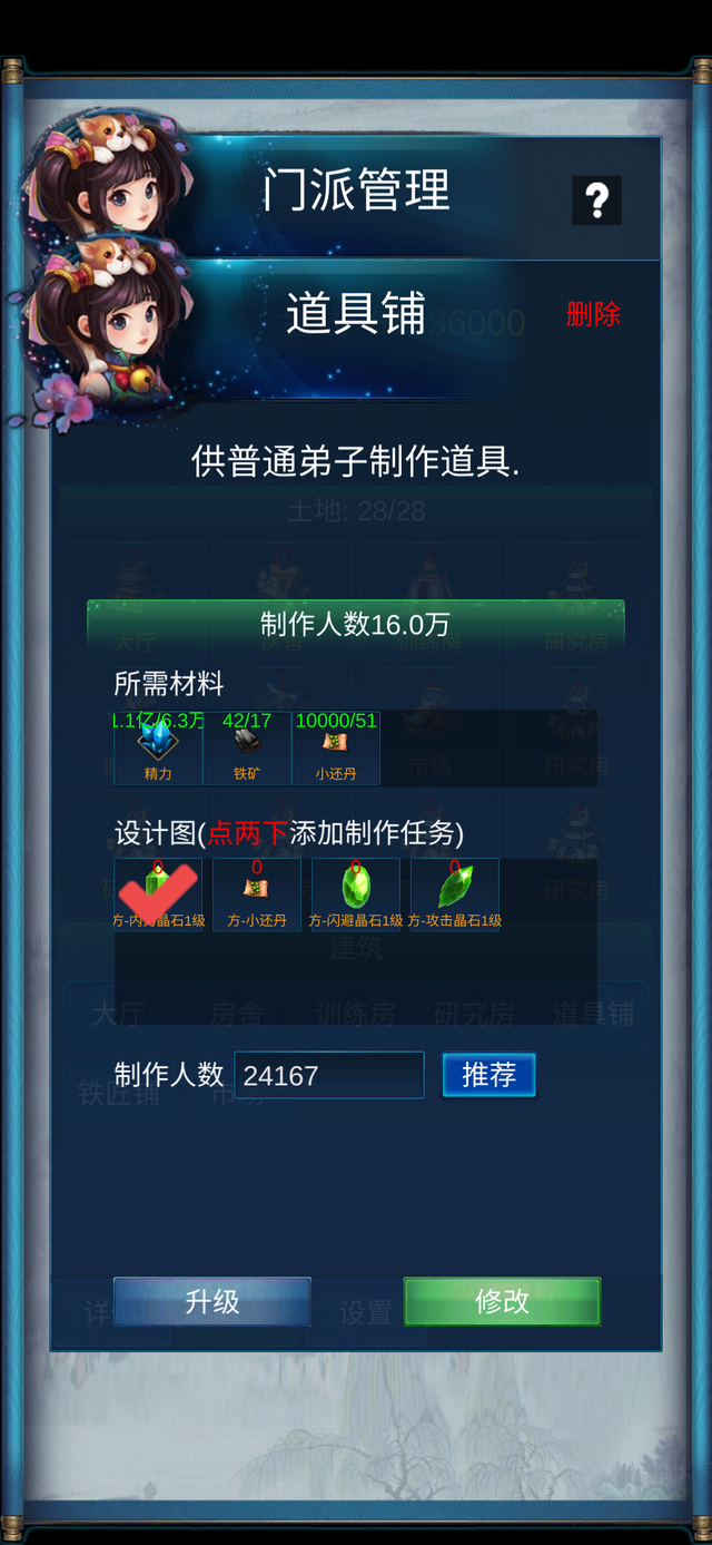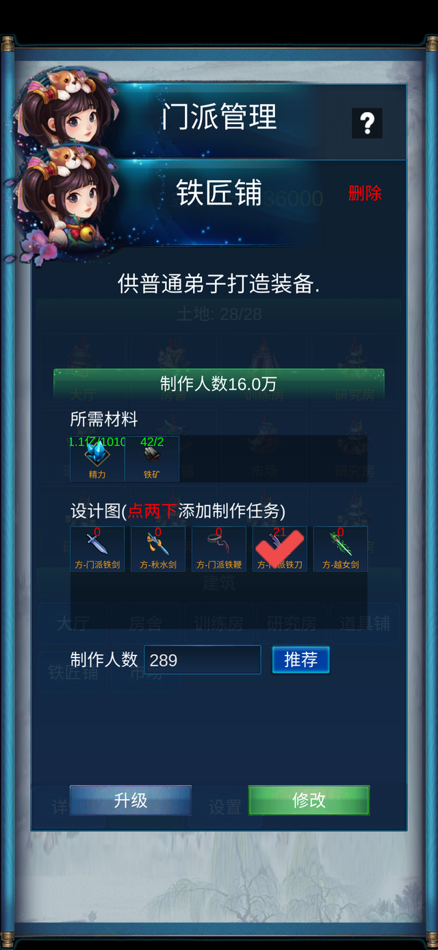 (2)因为弟子数量有限,铁匠铺的等级并不需要很高。