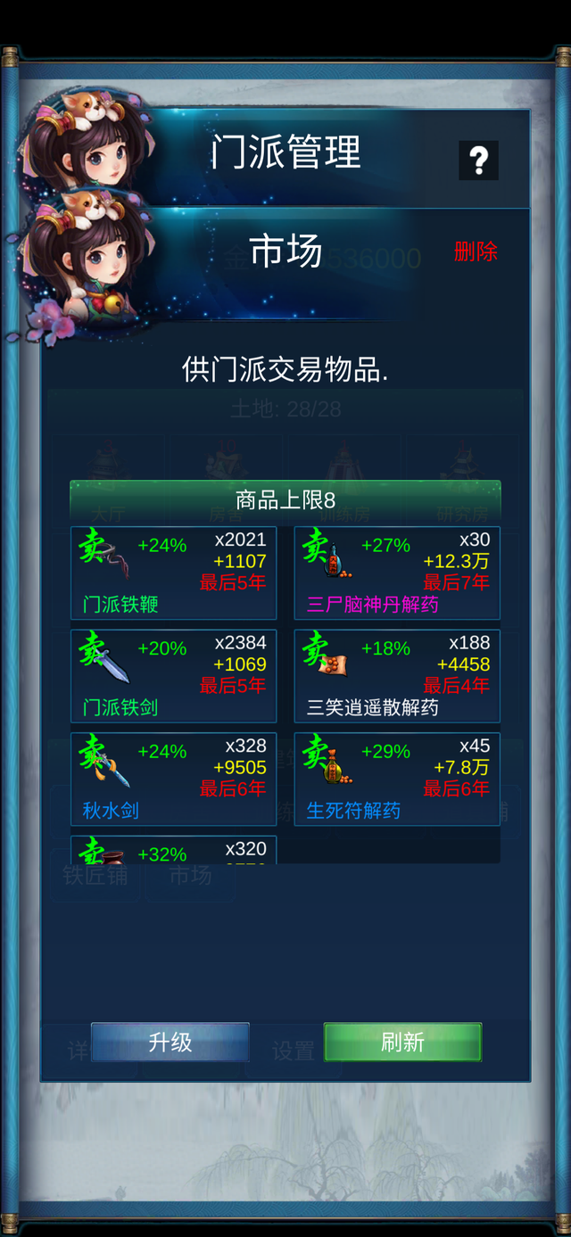 只能建造1个,可以升级,升级可以增加物品数量。市场主要作用是买卖,但是因为制作物品的难度较高,更多情况还是买制作材料。10万可以刷新一次商店,一年一次机会。