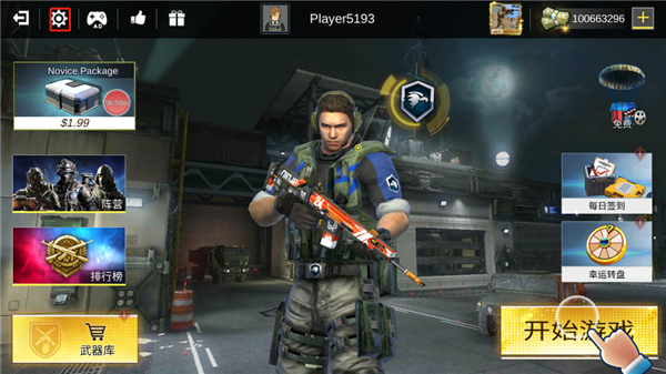 1、打开在本站下载的游戏,进入首页我们可以看到有阵营、排行榜、武器库等等功能板块,我们可以先点击齿轮状的设置键