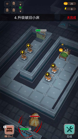 攒钱,把床升到每秒+32时直接把每一个炮台拉到二级,造一个一级手游机,然后升到一级铁门,之后把手游机升到2级,攒钱把铁门升二级,再拉一个二级手游机,铁门升到三级,再把床升到每秒+64,接着就把两边的炮台都变成喷射水枪,再造一个二级手游机,顺便建两三个自动修墙的