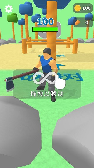2、如下图所示:玩家可以通过滑动屏幕控制人物行动路径,以便到达不同的地方。例如,走到树的前边,人物会自动砍树,走到建筑前边,会自动弹出建筑的功能页面